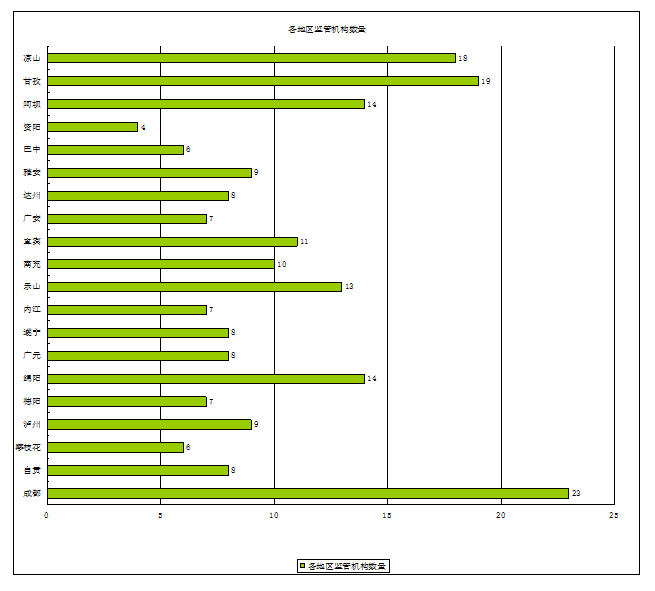 全省食品药品行政机构分布图 行政机构中,成都数量最多,共23个;资阳数量较少,为4个。副省级行政监管机构1个,成都局;市州级行政监管机构20个,除成都外各地分别一个。全省共有县区级行政监管机构195个,成都最多,22个;最少的资阳仅3个。 事业单位中,凉山最多,共63个;攀枝花最少,仅5个。副省级市下辖事业单位共3个,均为成都市;其余20个市州共下辖57个事业单位。全省共有县区级食品药品监管事业机构320个。 (二)事业单位 各级食品药品监管事业单位总数281个,其中,省局直属事业单位6个,市州局直属事业单位43个,县区局直属事业单位230个。 二、人员情况 (一)行政机构人员情况(详见附表2、3) 截至2016年底,全省各级食品药品监管行政机构共有编制14391人,其中省级编制138人,副省级编制105,市州级编制1071人,县区级编制13077人。全省实际在岗人员13130人,其中省级到岗人数128人,市州级到岗人数993人,县区级在岗人数11906人。